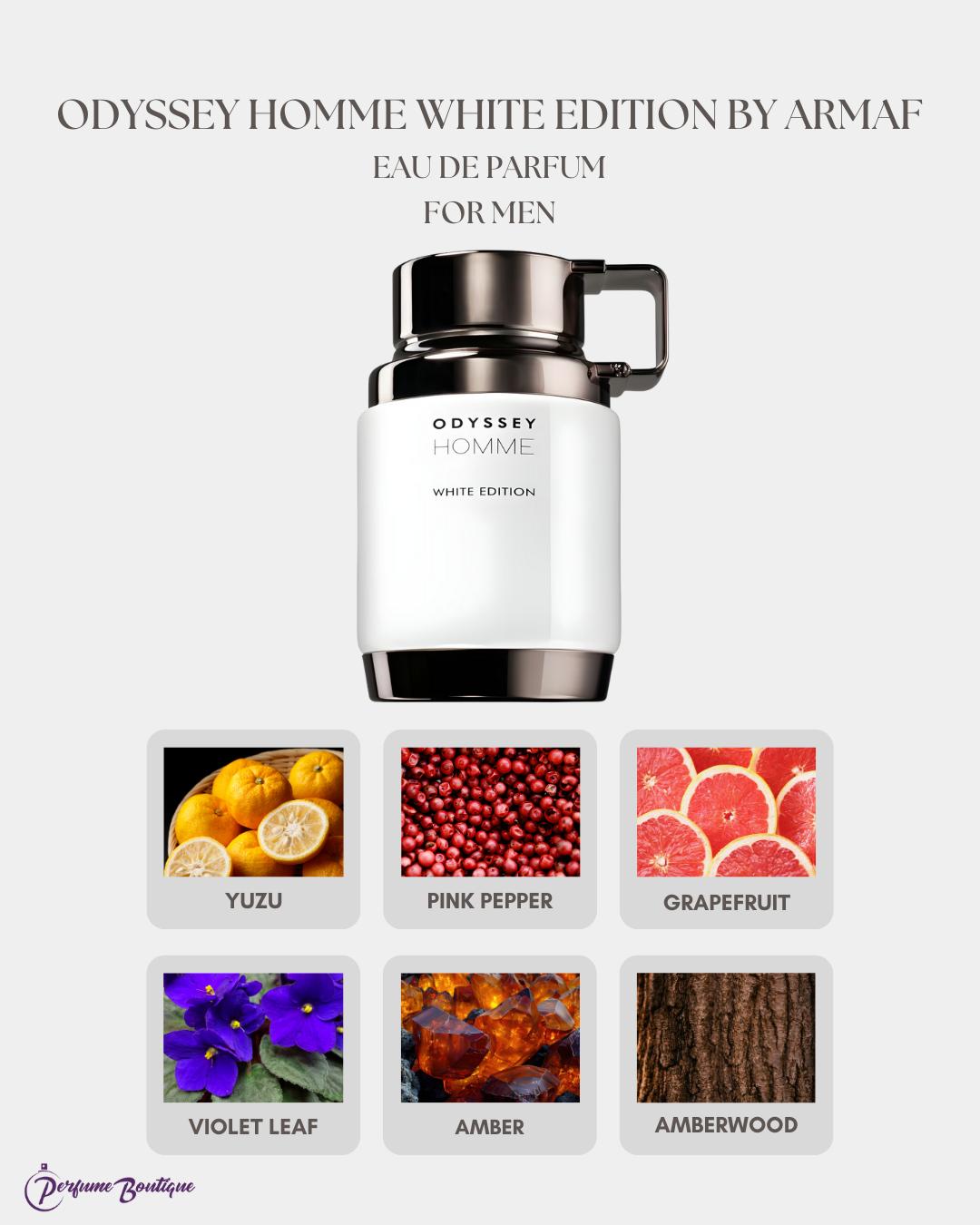 Odyssey Homme White Edition by Armaf is a Oriental Fougere fragrance for men. Top notes are Yuzu, Pink Pepper and Grapefruit; middle notes are Violet Leaf and Sea Notes; base notes are Amber, Amberwood and Guaiac Wood.
